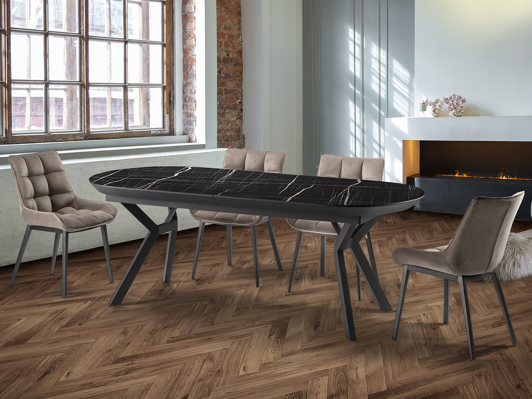 Mesa de comedor extensible, realizada en metal acabado negro mate y tapa de DM con superficie melamínica de alta resistencia, acabado mármol negro brillo, con cantos en negro mate. Extensible hasta 2,85 metros.