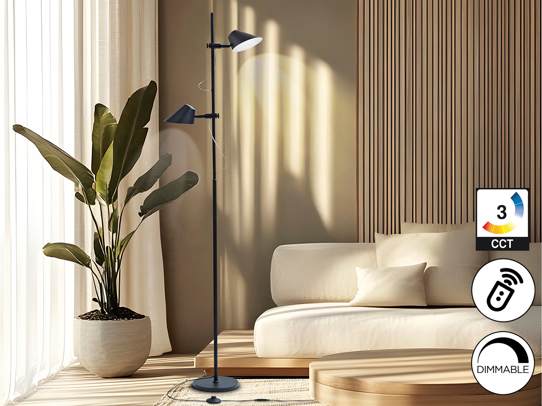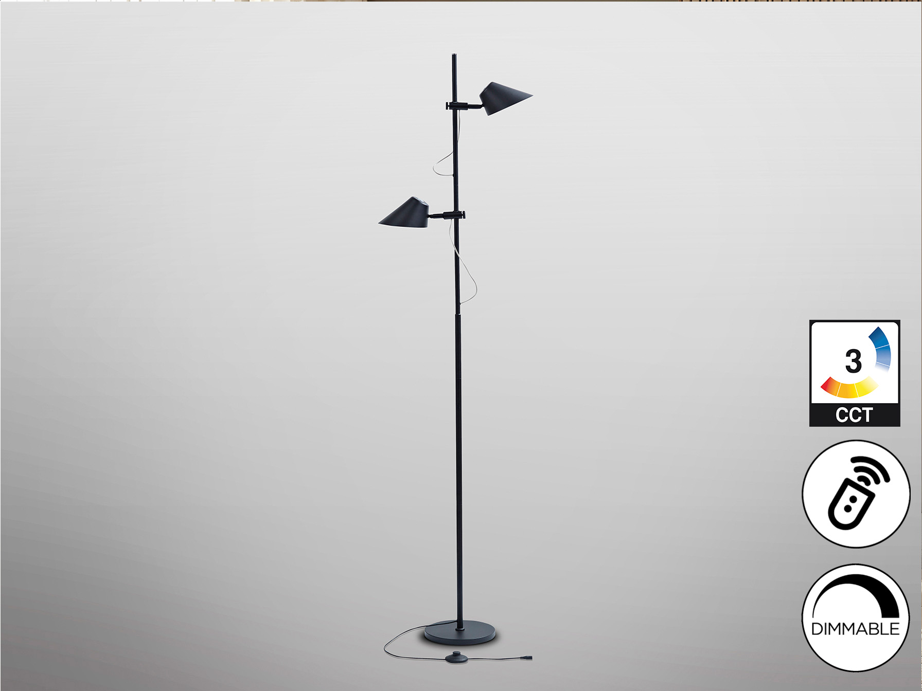 Lámpara de pie en metal y aluminio, color negro mate, difusor opal. Pulsador táctil y CONTROL REMOTO. 2 luces regulables en altura y orientables, funciones simultaneas e independientes: luz dimable, temperatura de color regulable. 20W LED, 1800 lm, C