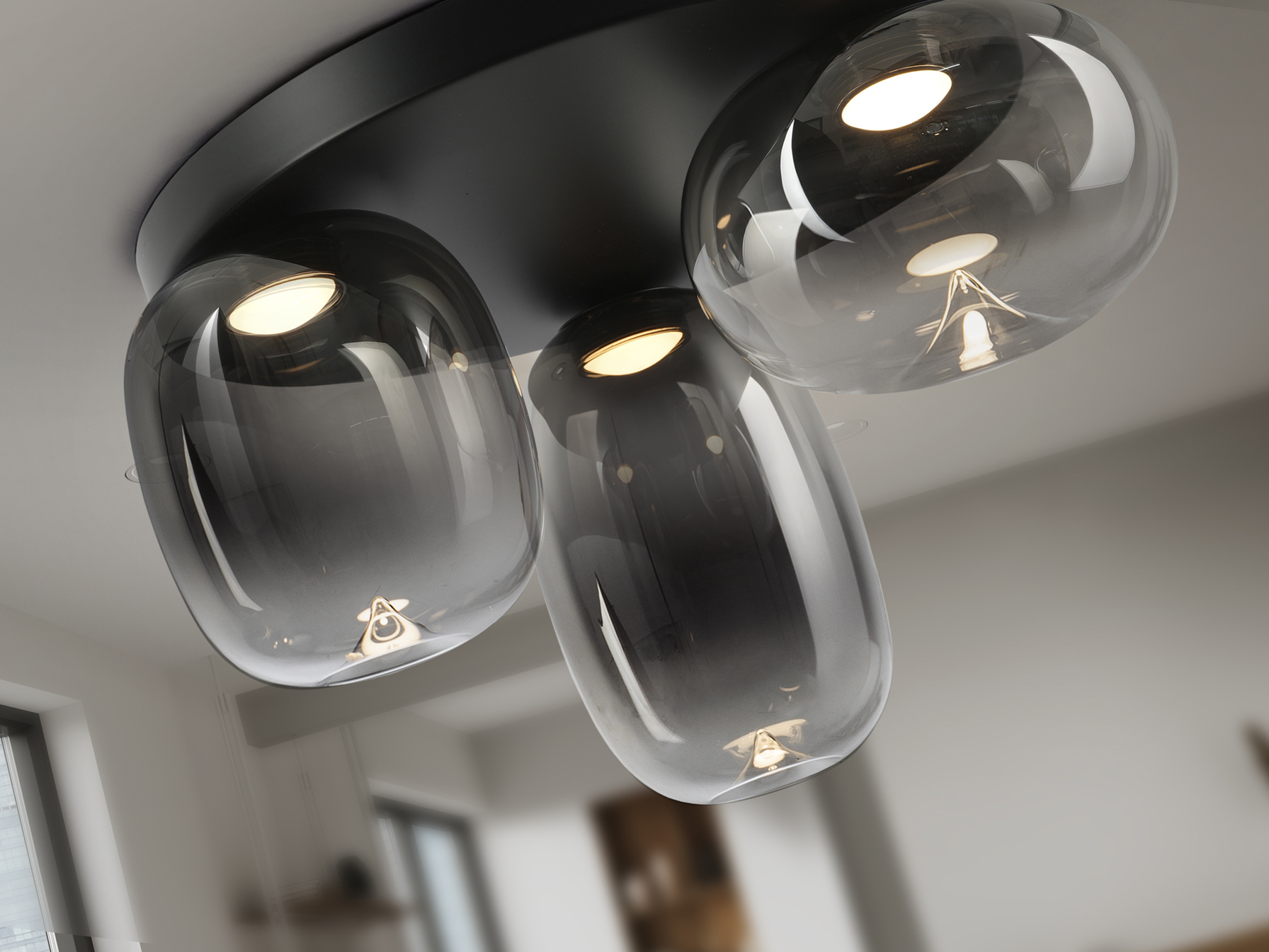 Plafón de techo de 3 luces realizada en metal acabado negro mate. Tulipas de cristal soplado, en acabado gris smoke difuminado a transparente. Regulable en altura. 18W LED, 1000 lm, 3.000 K.