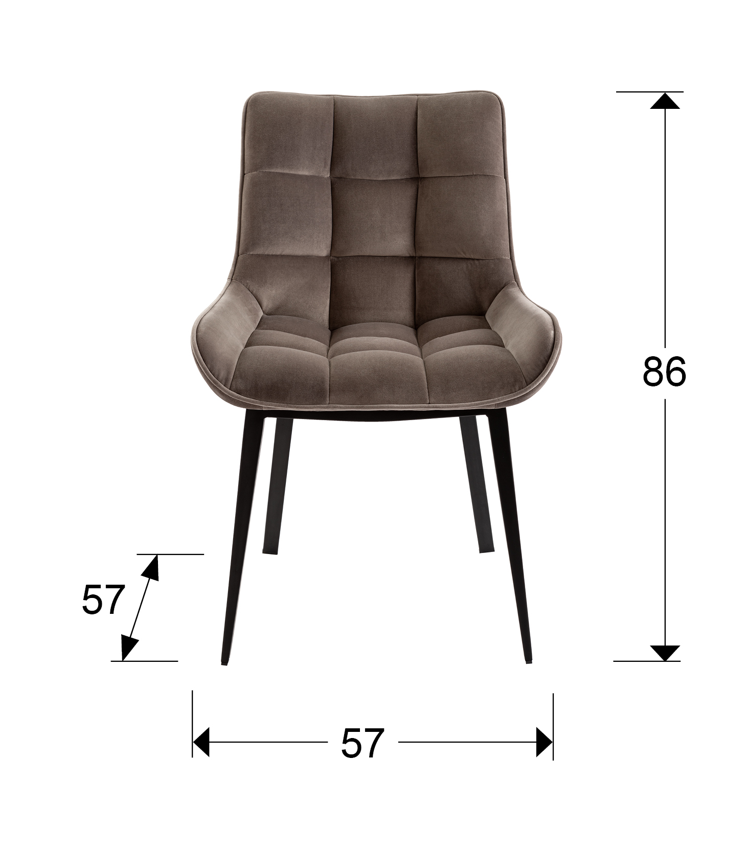 Silla realizada en metal, acabado negro mate. Asiento y respaldo de madera contrachapada y espuma. Tapizado textil en terciopelo de poliéster100% en color piedra.