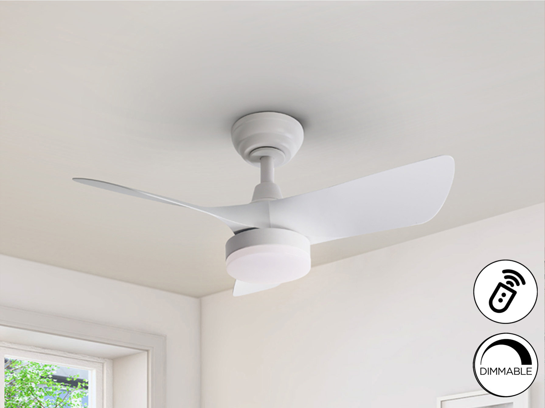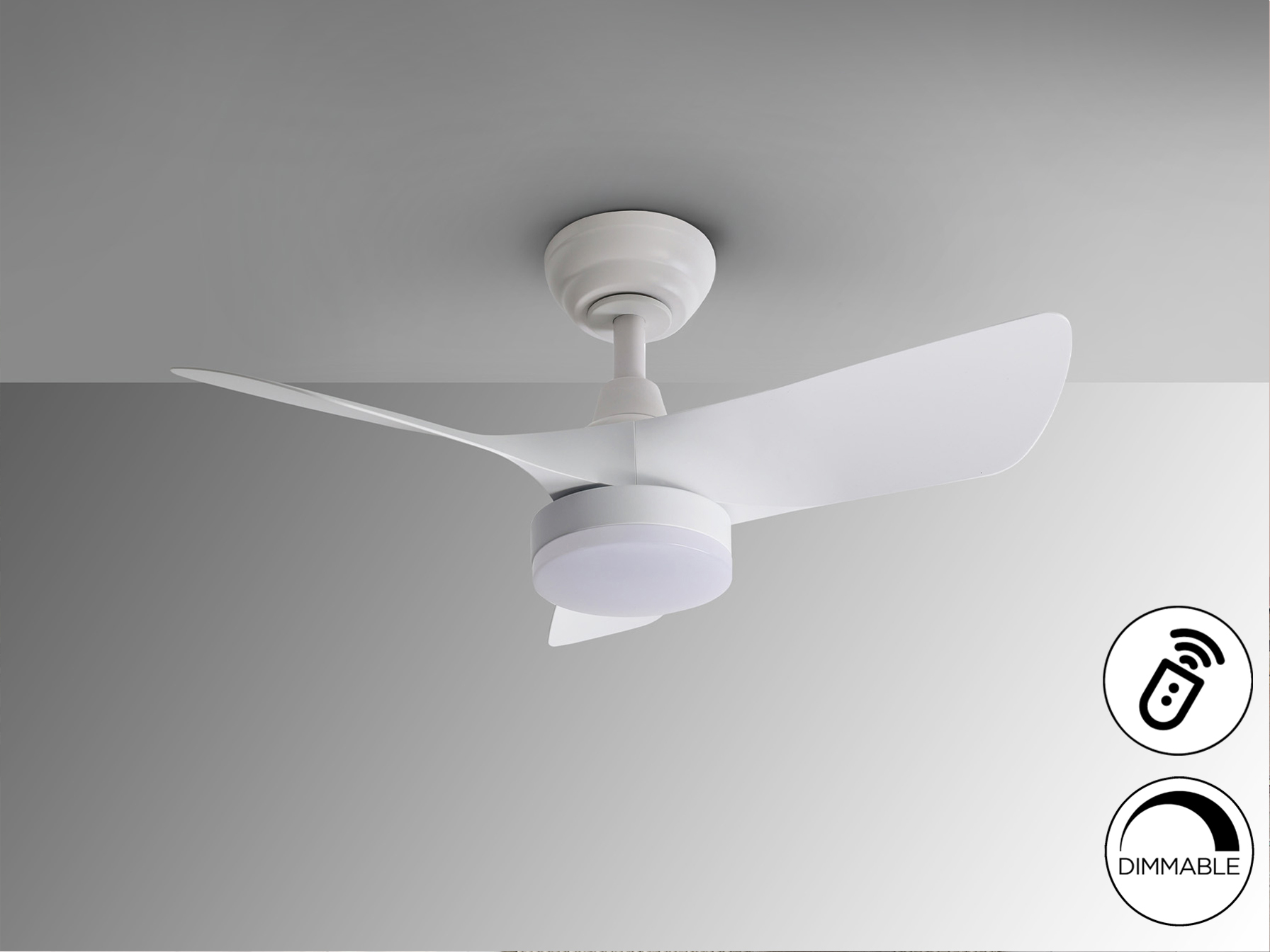Ventilador de techo con luz LED DIMABLE y CCT (temperatura de luz regulable). Realizado en metal y aspas en acrílico, acabado blanco mate. Difusor acrílico opal. Motor DC, 6 velocidades e inversión. Temporizador, función brisa y memoria.