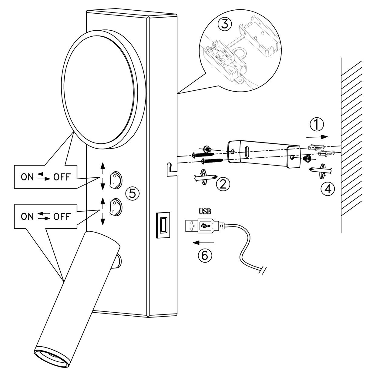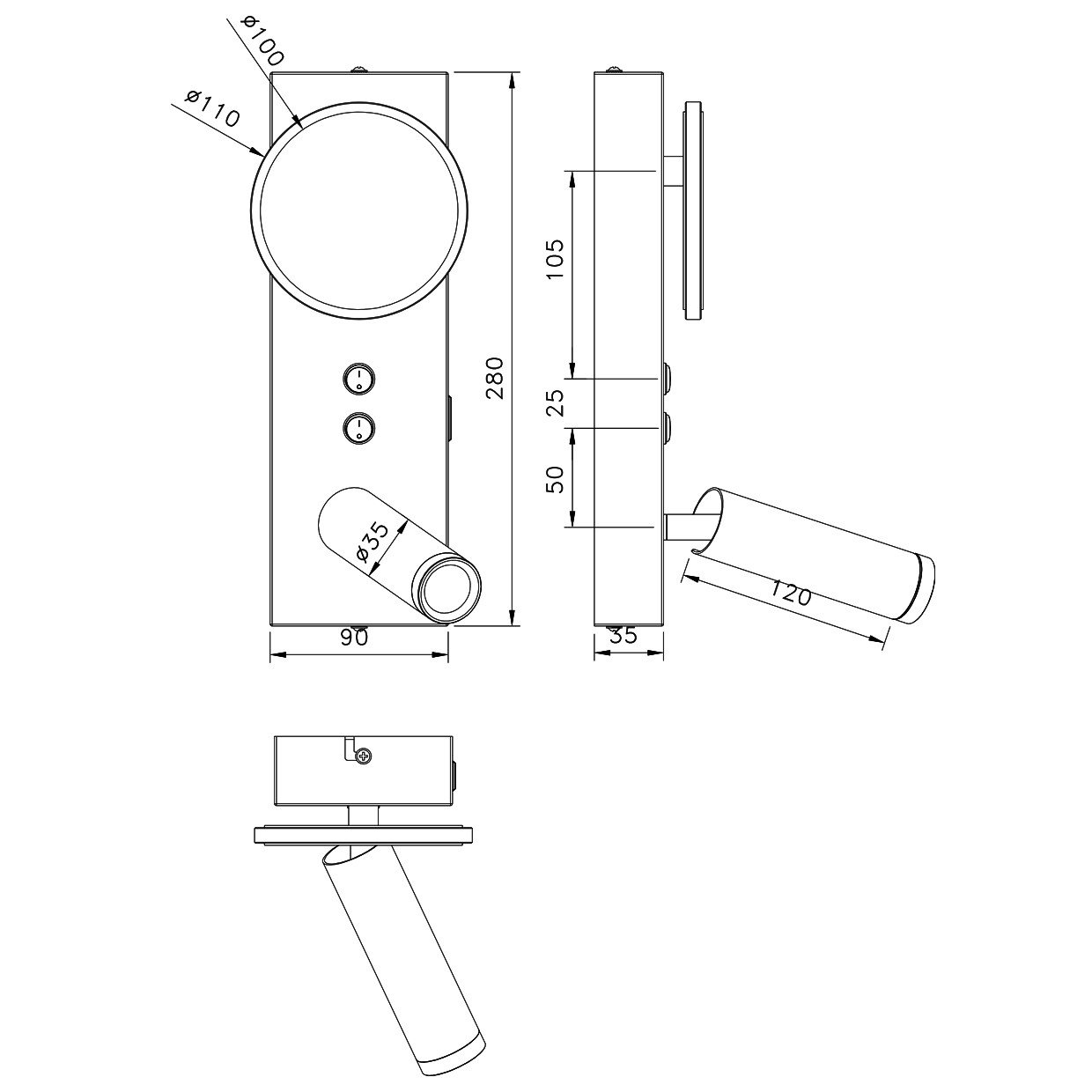 Base: 28×3,5x9cmMedida luz lector: Ø3,5x12cm – 3wdiametro luz led circular: Ø11cm – 5wNo dimable.Doble interruptor ON/OFF