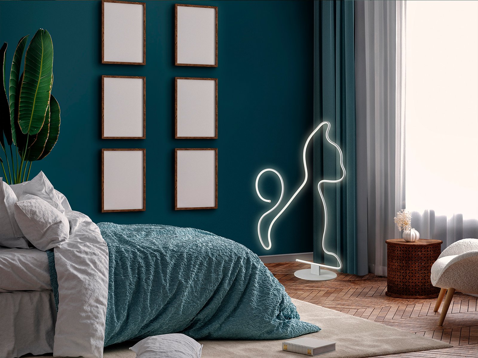 Lámpara de pié, realizada en metal y aluminio, acabado blanco mate. Difusor de silicona opal. 43W LED, 3.600 lm, 3.000K.