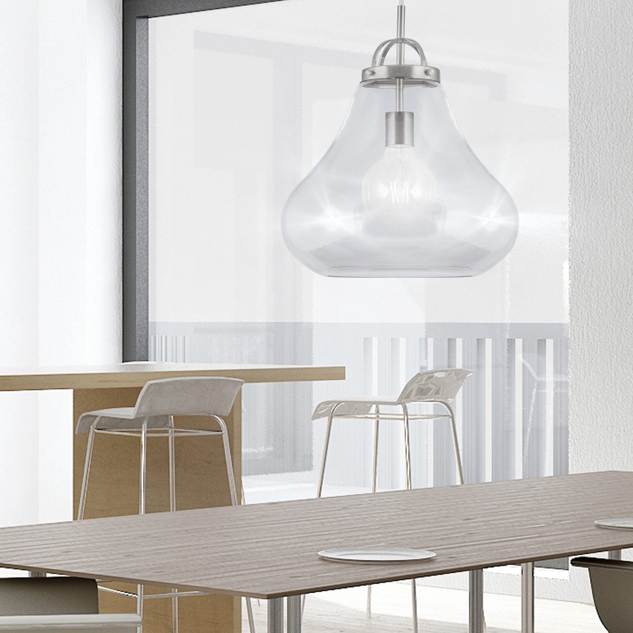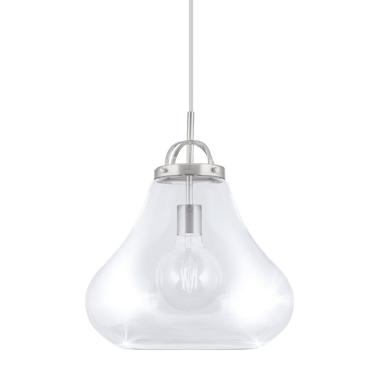 Lámpara de techo / Colgante de la Colección Capri en acabado níquel satinado. Tulipa fabricada en cristal con acabado transparente y soporte metálico en níquel satinado. Una pieza de estilo industrial donde prima la sencillez. Usa bombilla de E-27,