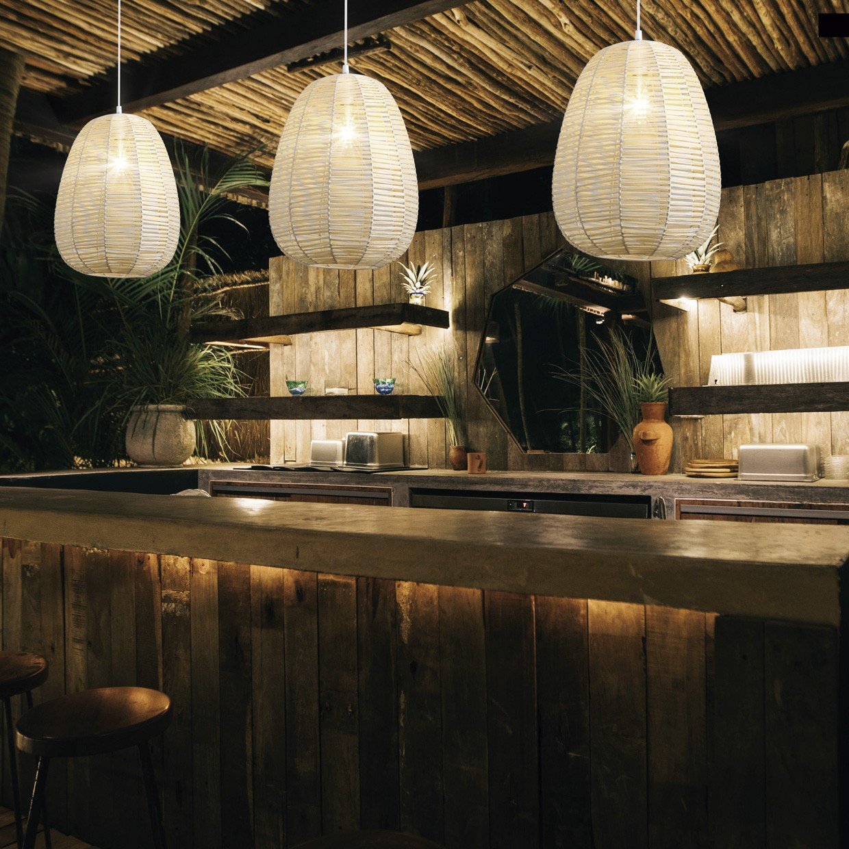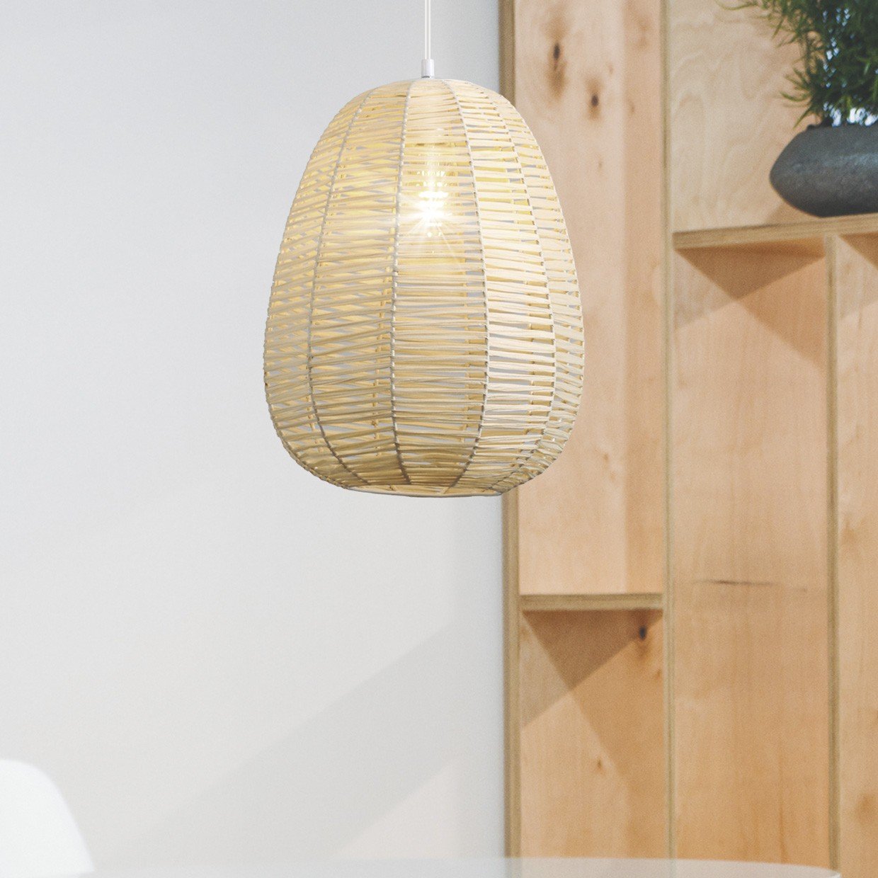 Colgante de la colección OPRA, en acabado natural/beige. Está fabricado con fibras naturales que se entrelazan sobre la estructura metálica. Formas orgánicas que se inspiran en las colmenas, como línea argumental de esta colección de luminarias.