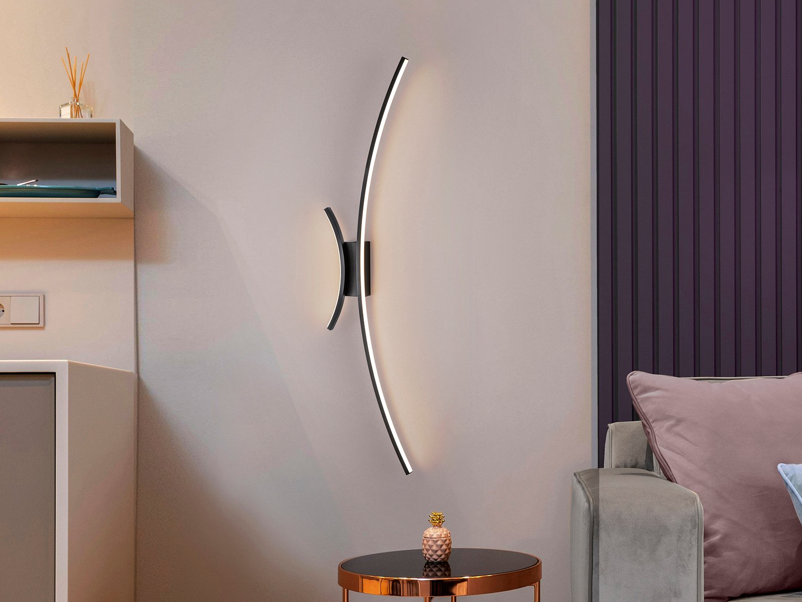 Lámpara de pared , realizada en aluminio y metal, acabado negro mate. Brazos curvados con luz LED y difusor de silicona opal. 21W LED, 1.450 lm, 3.000 K.