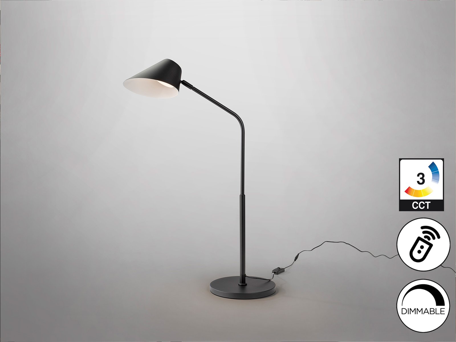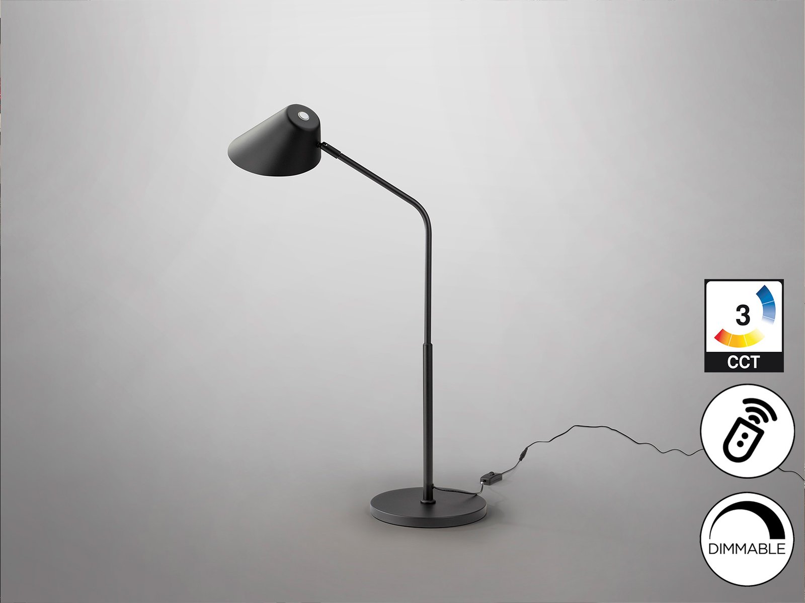 Lámpara de sobremesa, realizada en metal y aluminio, acabado negro mate, difusor opal. Pulsador táctil y CONTROL REMOTO. Foco orientable, luz dimable, temperatura de color regulable. 12W LED, 1300 lm, CCT 3000K-6500K.