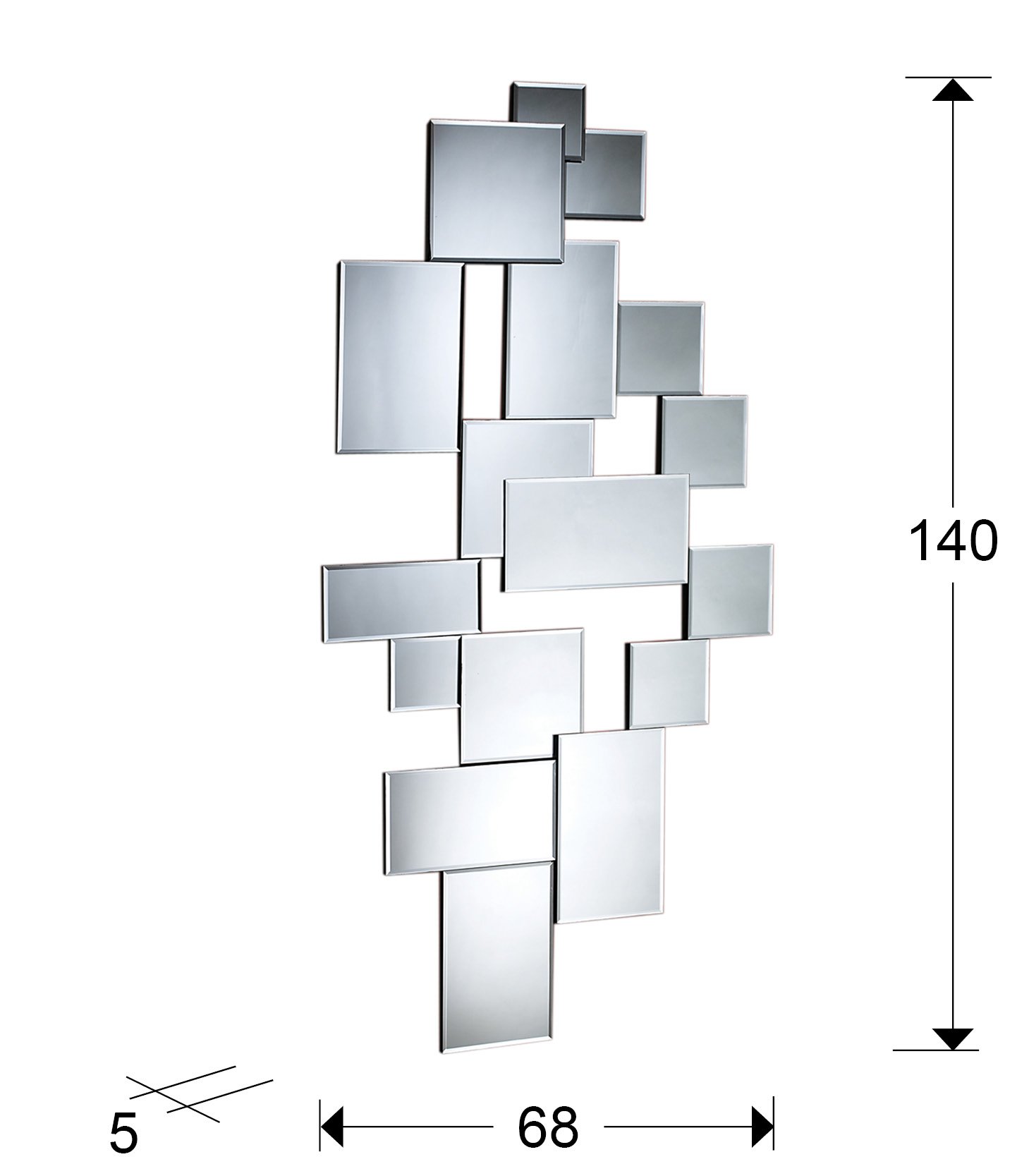 Espejo realizado con espejos de diferentes tamaños con cantos biselados. Los espejos se apoyan sobre una trasera de DM color negro. Preparado para colgar en posición horizontal o vertical.