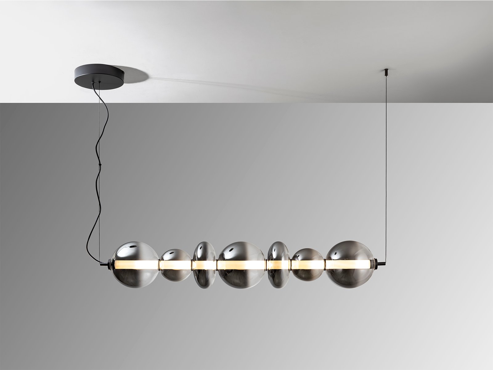 Lámpara realizada en metal acabado negro mate, con cilindro interior opal y Tulipas de cristal soplado, en acabado gris smoke difuminado a transparente. Regulable en altura. Permite instalación en posición horizontal y vertical. 24W LED, 4000 lm, 300