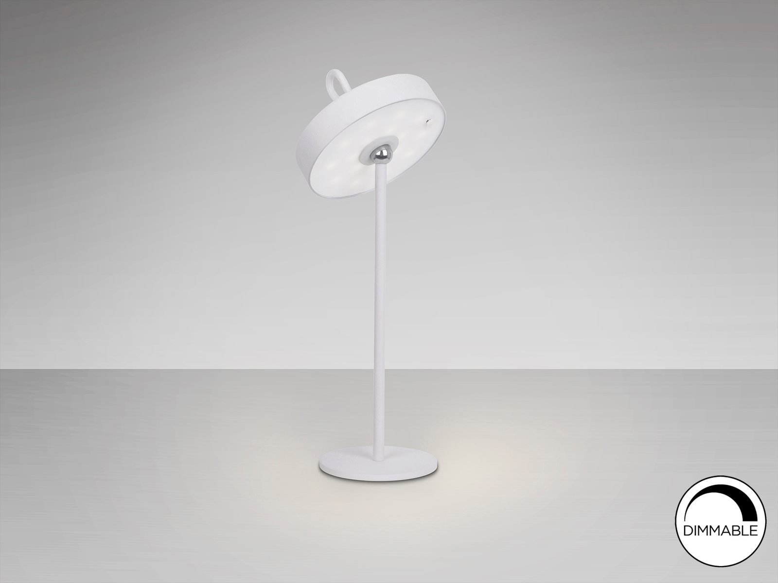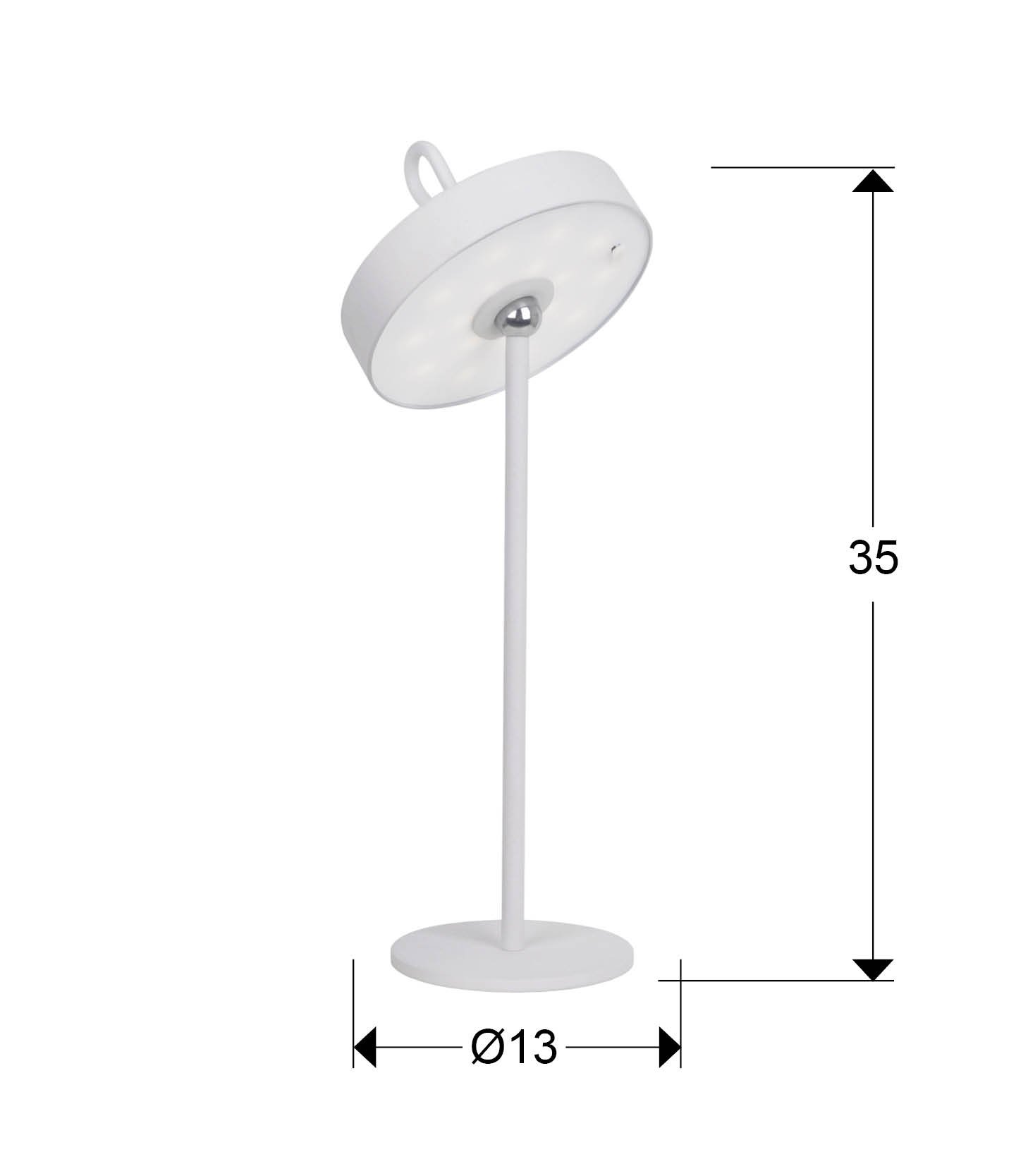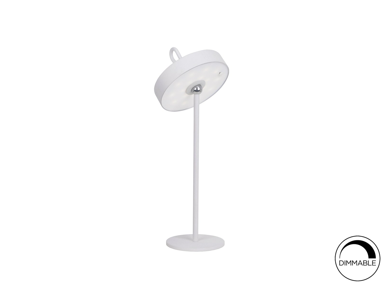 Sobremesa LED para interior y exterior, pantalla portátil con asa de silicona y soporte magnético. Realizado en metal acabado blanco y difusor acrílico opal. 2,5W LED, 140lm, 3000K. DIMABLE. IP54.
