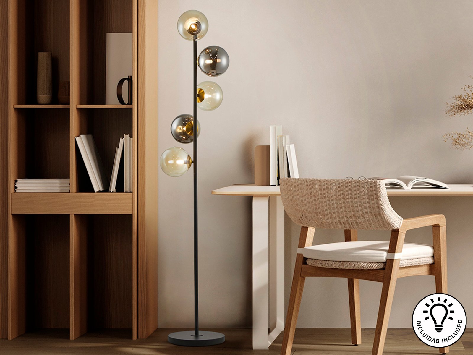 Lámpara de pie realizada en metal, acabado negro mate y latón satinado. Tulipas esféricas de cristal acabados en ambar y gris smoke espejado.
