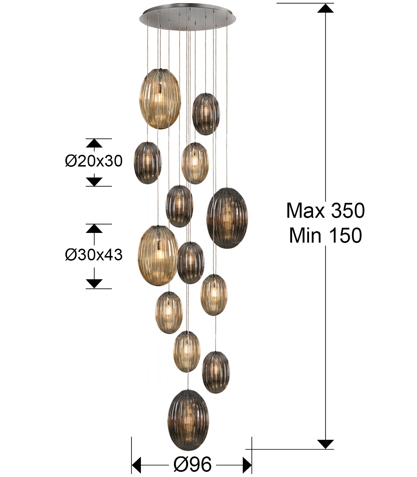 Lámpara de 13 luces, realizada en metal acabado cromo. Tulipas combinadas: grandes y pequeñas. Dos tonos de cristal: coñac y gris smoke espejado. Regulable en altura. DIMABLE. Incluye mando a distancia.
