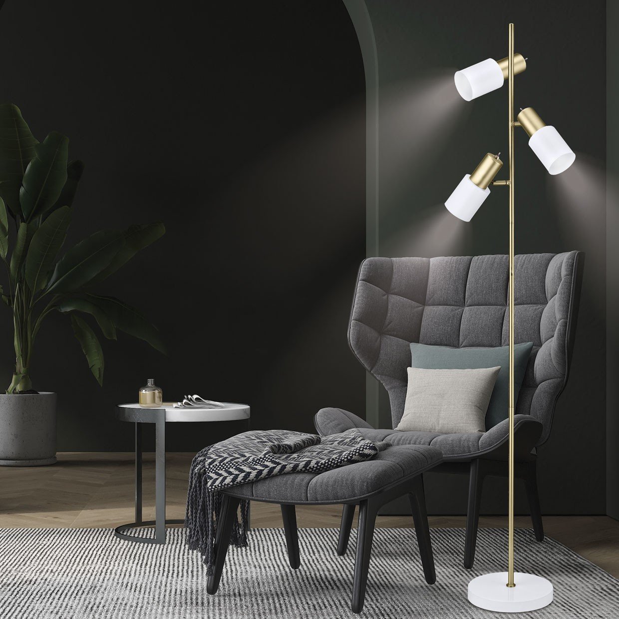 Lámpara de pie / Pie de salón de la Colección Maena. Fabricado en metal, acabado en blanco y latón, dispone de 3 cabezales orientables e interruptor ON/OFF en cada cabezal. Usa bombillas E-14, 3 x E-14 40W Max., compatibles con bombillas LED (no incl
