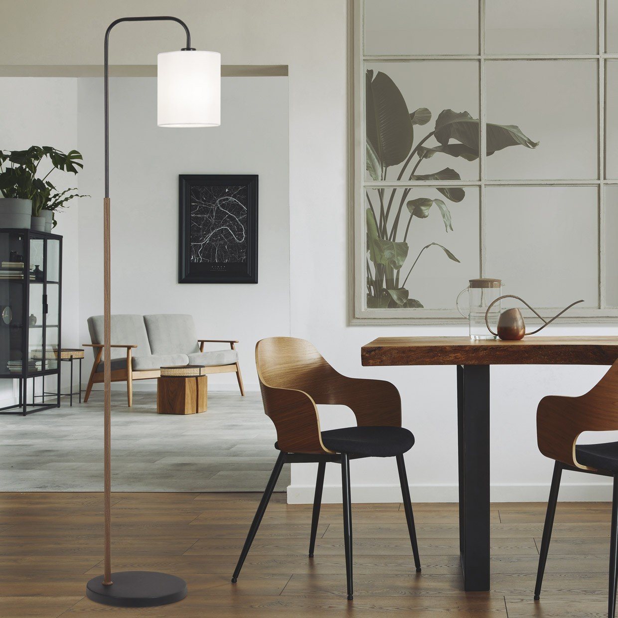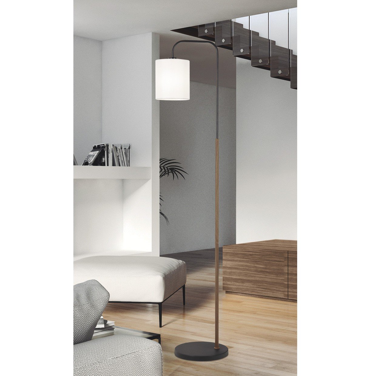 Pie de salón de 1 luz de la Colección BERTA. Una sencilla propuesta, fabricada en metal, en acabados negro y madera y pantalla de tela color blanco. Usa bombillas E-27, 1 x E-27 60W Max., compatibles con bombillas Led (no incluida).Un diseño sencil