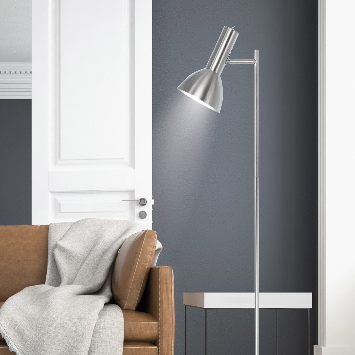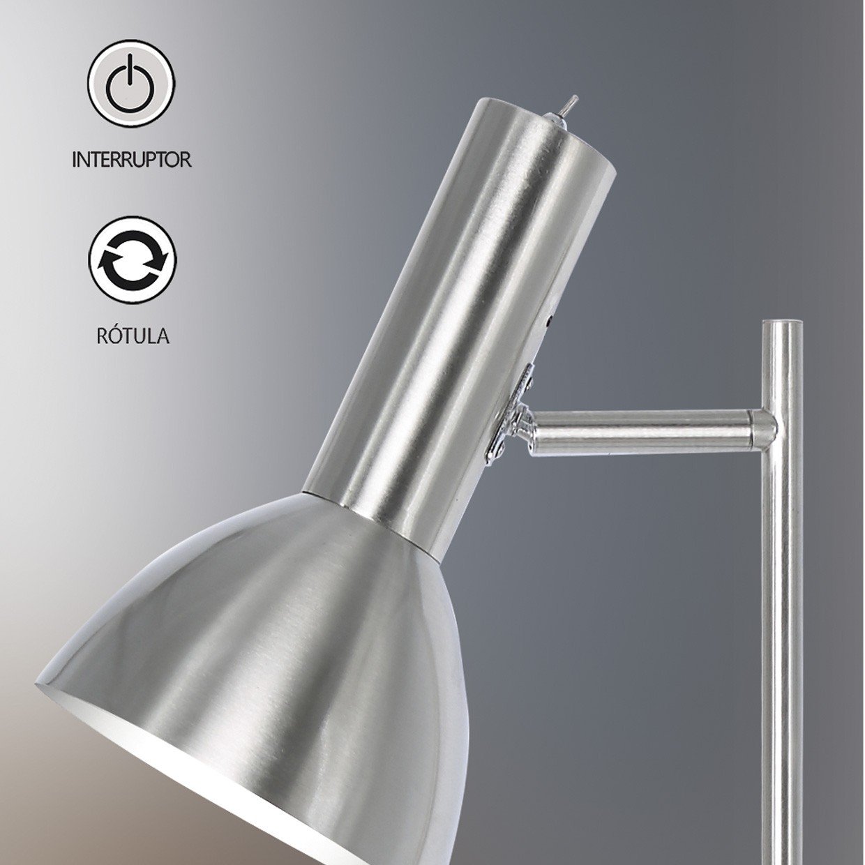 Lámpara de pie / Pie de salón de la Colección LUMIERE. Fabricado en metal, acabado en níquel satinado, dispone de cabezal orientable e interruptor ON/OFF en el cabezal. Usa bombillas E-27, 1 x 60W Max., compatibles con bombillas LED (no incluidas). I