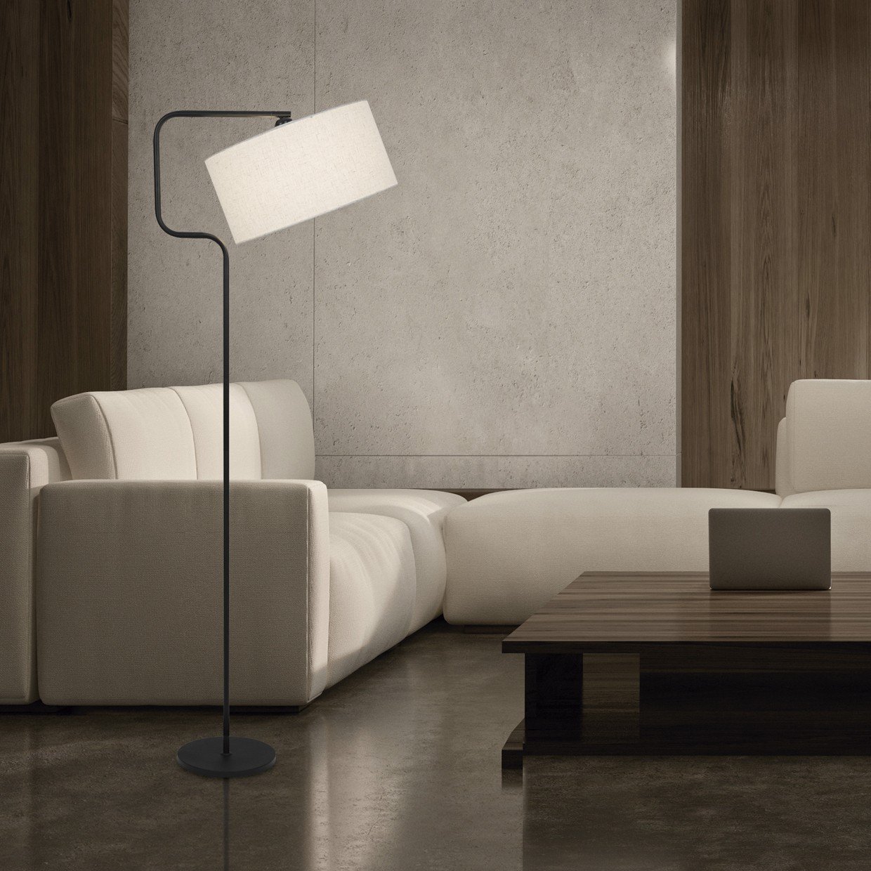 Lámpara de pie / Pie de salón de la Colección OLFO. Fabricada en metal en acabado negro con pantalla de lino natural orientable. Usa bombilla E-27, 1 X E-27 60w Max. (No incluida) compatible con bombillas Led. Un diseño moderno y elegante que lo hac