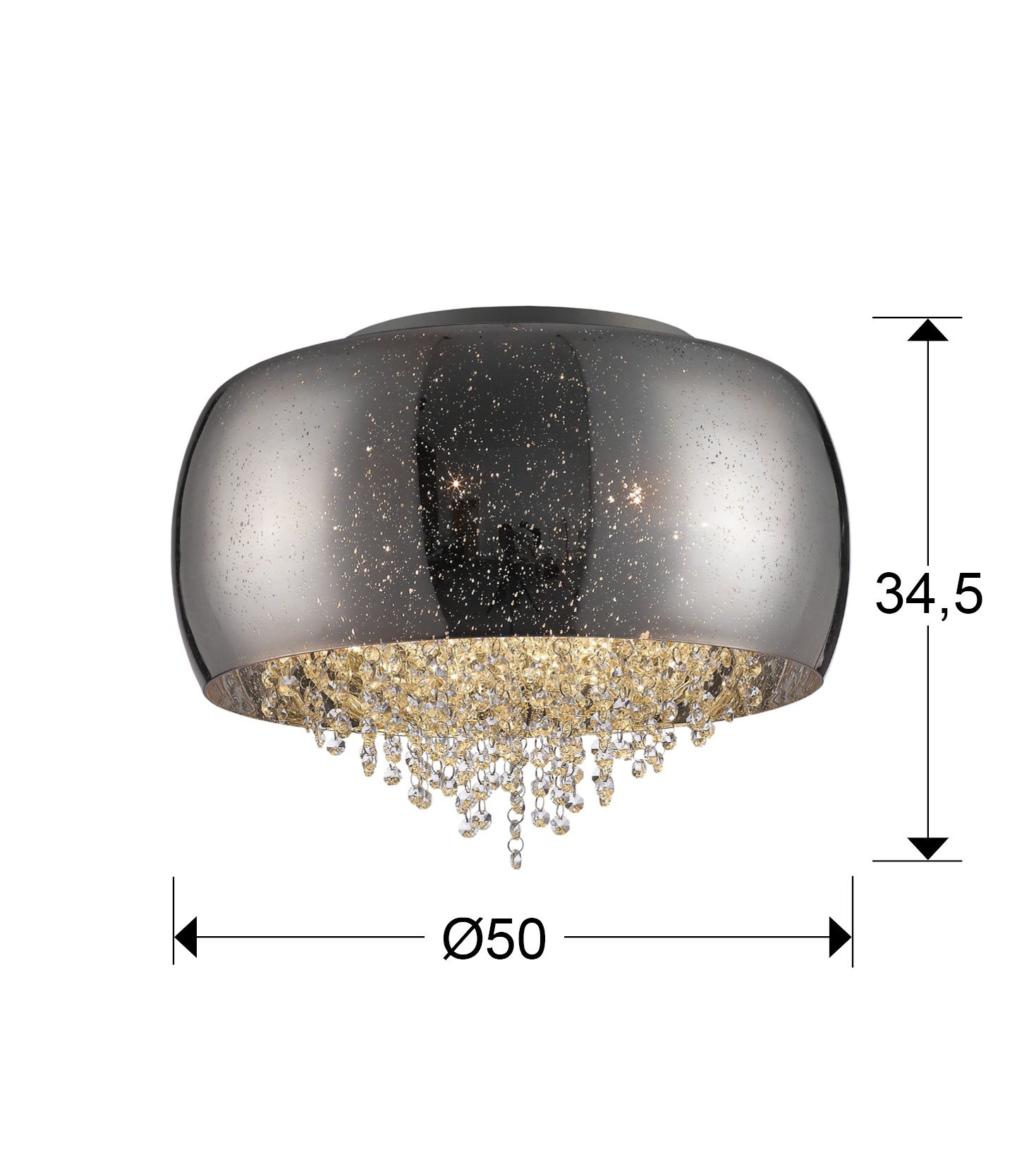 Plafón de techo realizado en metal acabado cromo. Tulipa de cristal soplado en color plata espejado. Decoración efecto estrellado. Interior con tiras de cristal facetado.