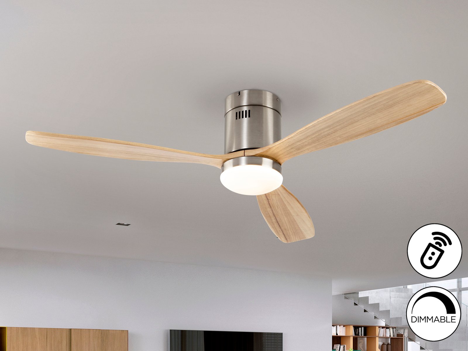 Ventilador de techo con luz LED. Dimable. Realizado en metal acabado niquel satinado y aspas en madera acabado natural. Difusor de cristal opal. Ventilador con Motor DC de 6 velocidades e inversión. LED CCT de 3 tonos de temperatura de color. Tempori