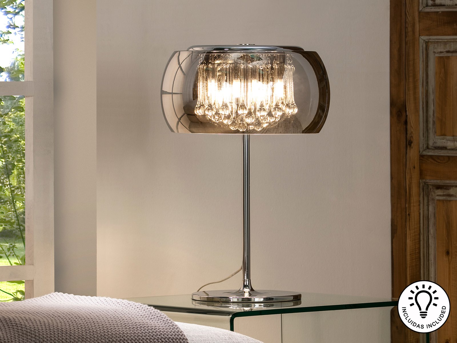 Lámpara sobremesa de 4 luces realizada en metal acabado cromo. Tulipa de cristal espejado y lágrimas interiores de cristal tipo murano. Clavija tipo G (Inglesa).