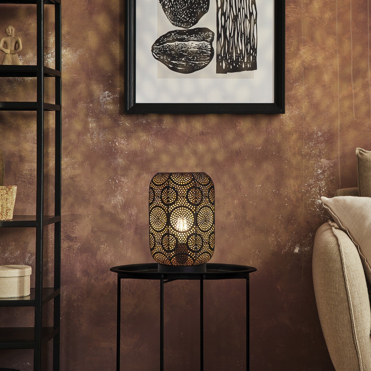 Lámpara de sobremesa de la Colección Bisbe. Fabricada en metal decorado con perdoraciones que forman un patrón, exterior en negro mate e interiror en oro mate. Usa bomillas E-27, compatibles con bombillas Led (no incluidas) 1 x E-27 60W Max. Esta lám
