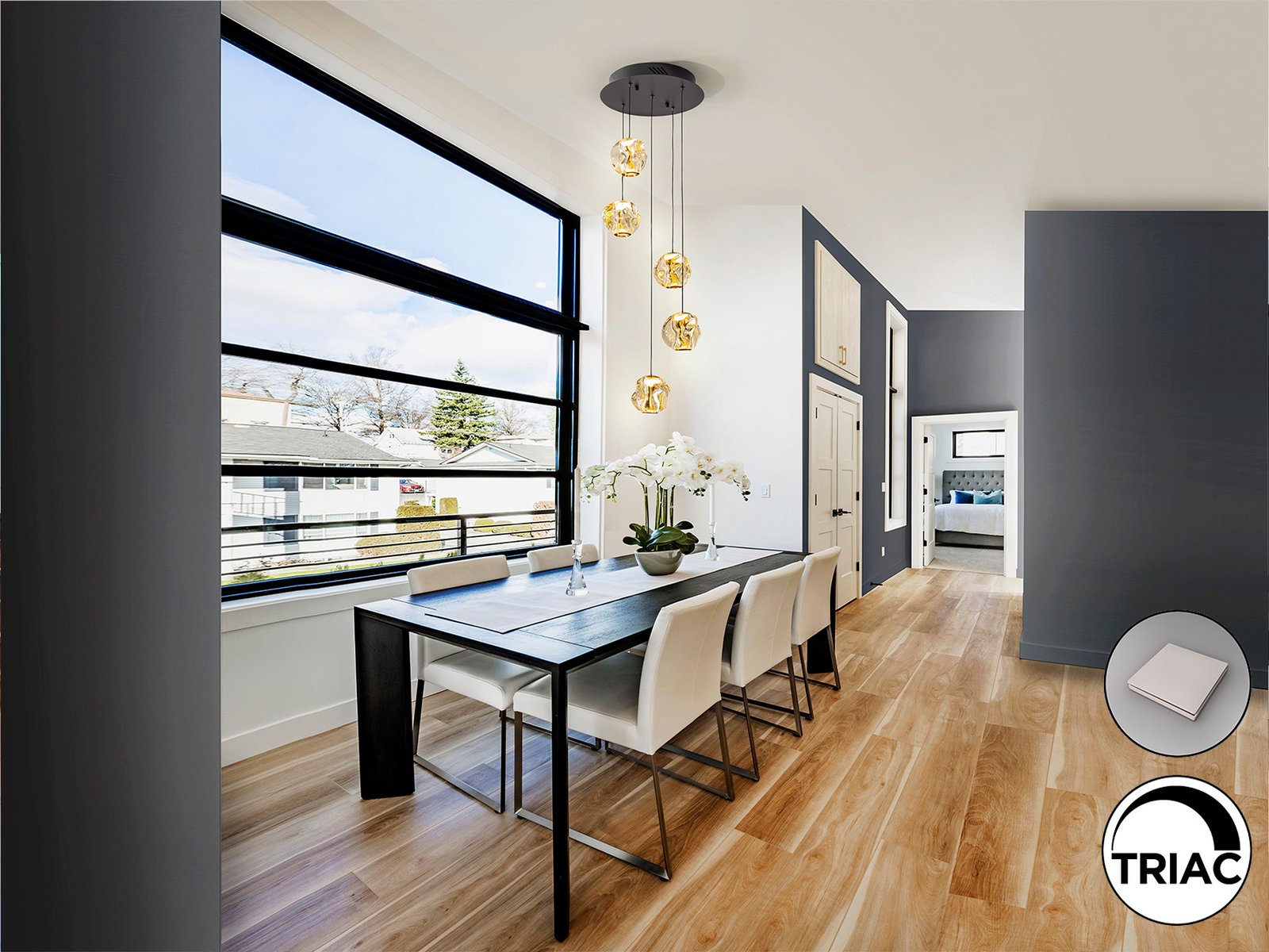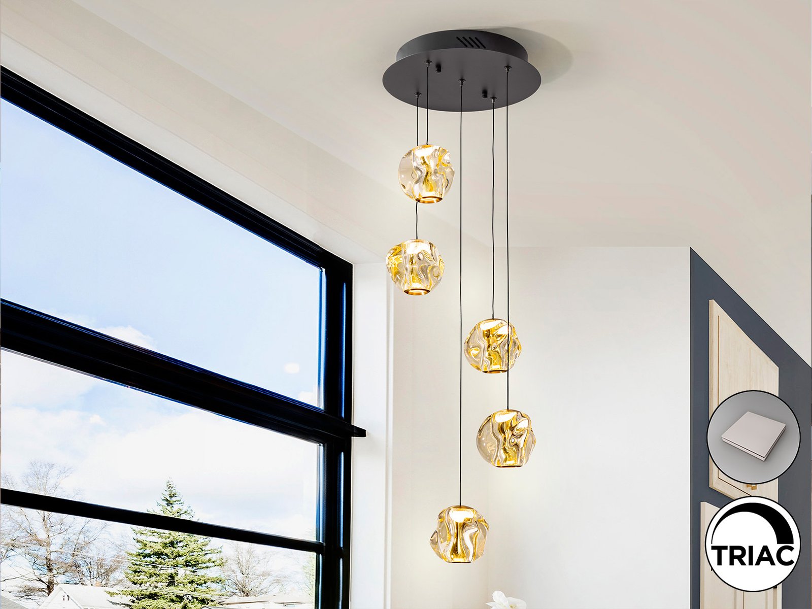 Lampara de 5 luces, realizada en metal acabado negro mate con detalles en bronce y tulipa de acrílico ambar. 21W LED, 1304 lm, 3000K. Incluye driver TRIAC y SET DIMADO.
